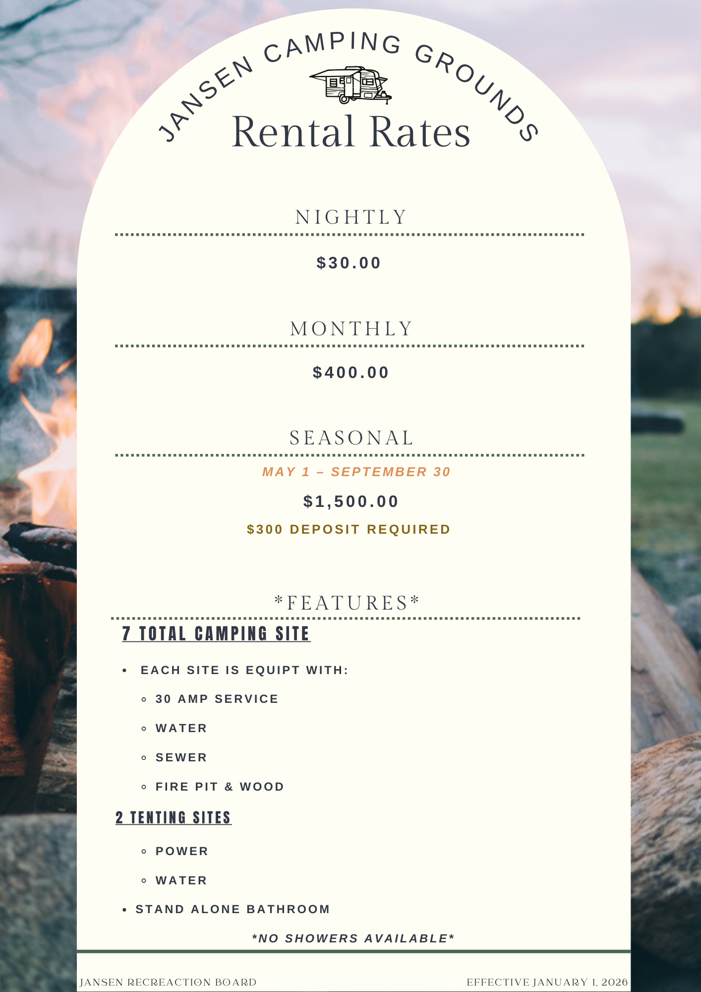 Campgrounds are located on Holloway Street South side of our Community Centre.